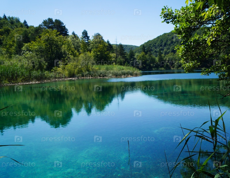 Красивая сине-зеленая вода в солнечный день в озере в Плитвицах