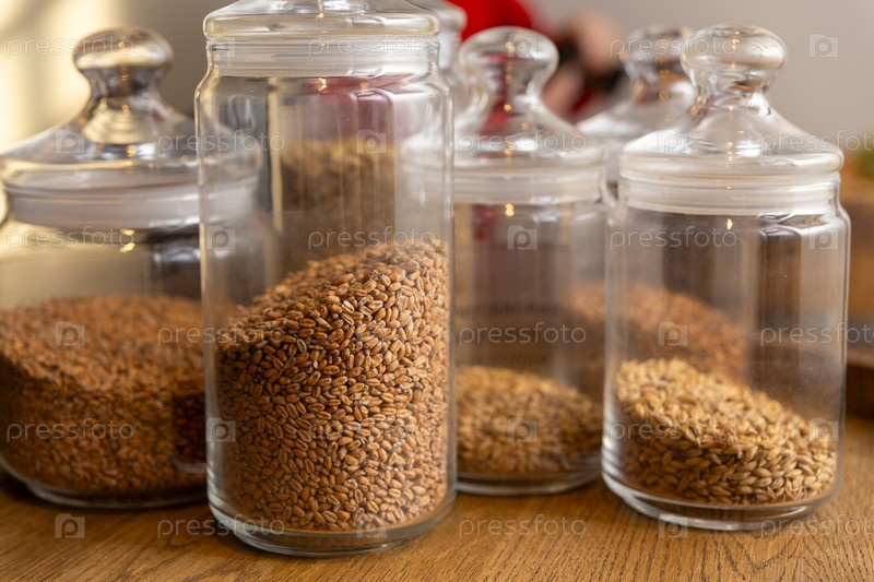 Различные виды солодового солода в стеклянных горшках на деревянном подносе. Ингредиенты для производства различных сортов пива