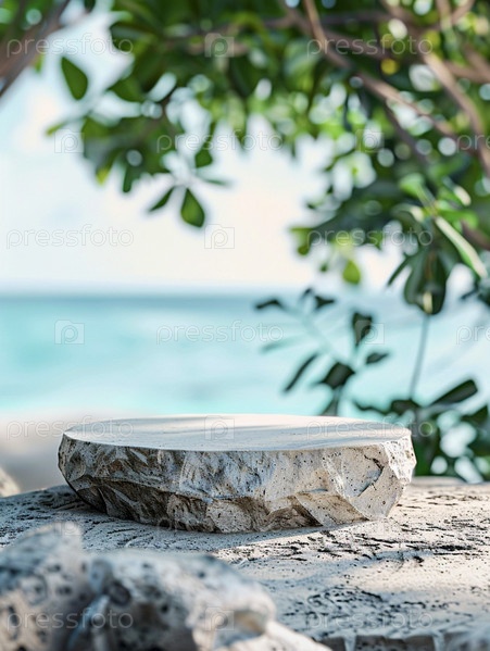 Пустой подиум из скалы с океаном и пальмами на заднем плане