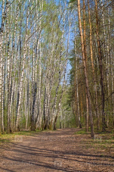 Тропинка в весеннем лесу. Теплостановский лесопарк, Москва. Солнечный день в начале мая