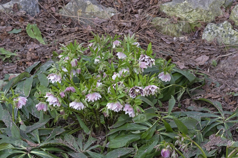Цветение восточного морозника (лат. Helleborus orientalis).Москва, Аптекарский сад, начало апреля