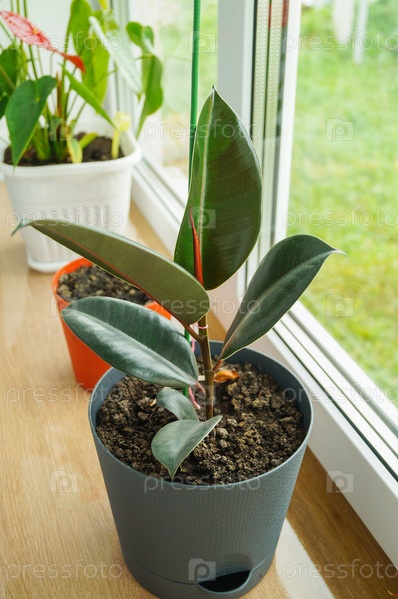 Цветок фикуса с большими листьями в горшке на подоконнике