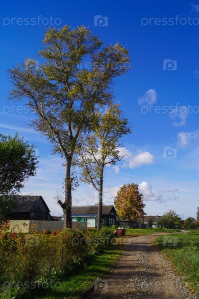 Красочный осенний пейзаж в деревне с голубым небом