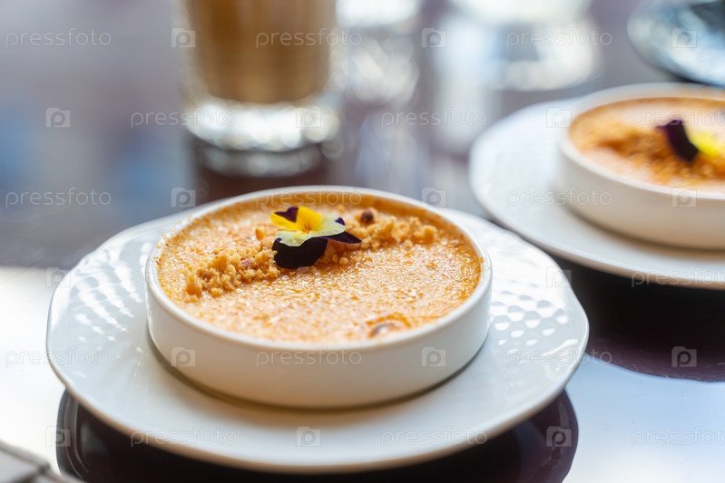 Карамелизированный испанский десерт. Кремада Каталония крема. Сладкое блюдо подается в кафе. Кофе с молоком на заднем плане. Естественный свет, избирательный фокус