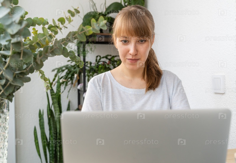 Молодая женщина работает онлайн на ноутбуке. Растения и цветы для рабочего места на балконе в дневное время. Расслабляющая атмосфера. Цветочное и ботаническое исследование. Дом садовника
