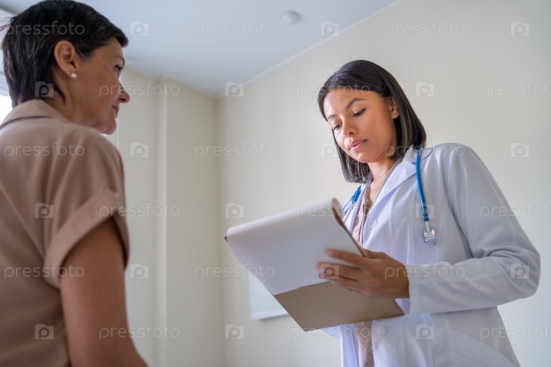 Афро-американский врач внимательно слушает жалобы пациенток среднего возраста. Медицинский осмотр в офисе клиники. Делать заметки в буфере обмена во время встречи. Вид снизу