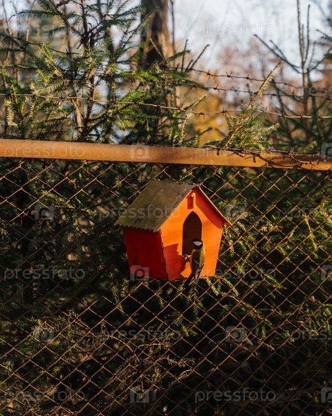 Оранжевый деревянный скворечник на заборе. Елки на заднем плане. Осенняя атмосфера