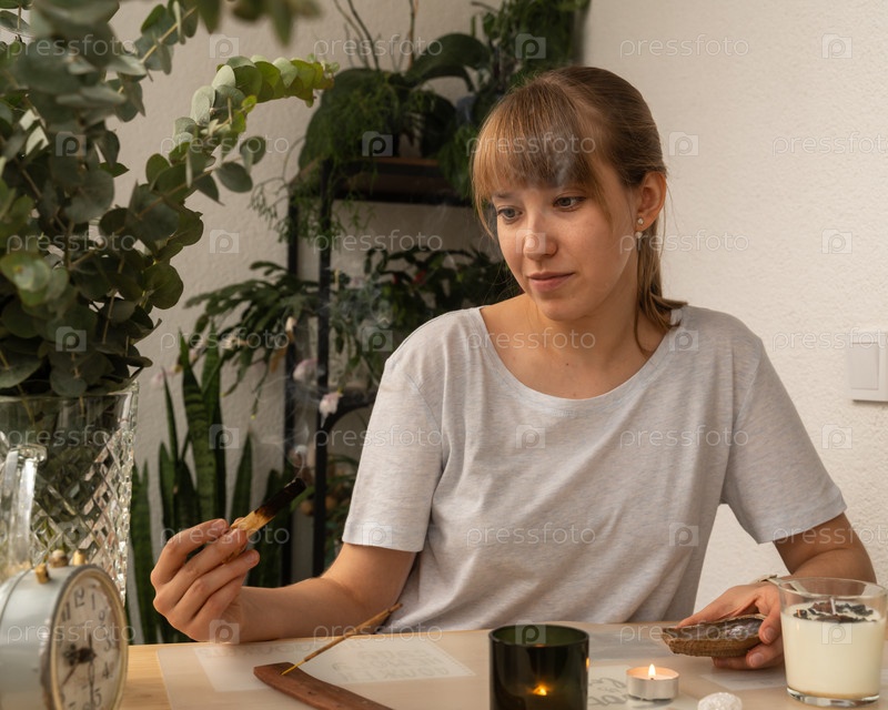 Портрет молодой женщины с тлеющей палочкой благовоний. Растения фона. Концепция расслабляющего отдыха