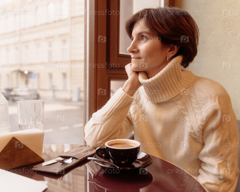 Улыбающаяся и заботливая женщина в свитере смотрит в окно кафе и пьет кофе