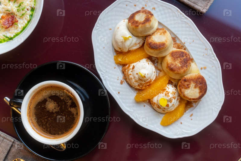 Сладкий и хорошо сервированный завтрак в кафе. Чизкейки с белым кремом, персиками и чашкой американо. Горизонтальный, над головой