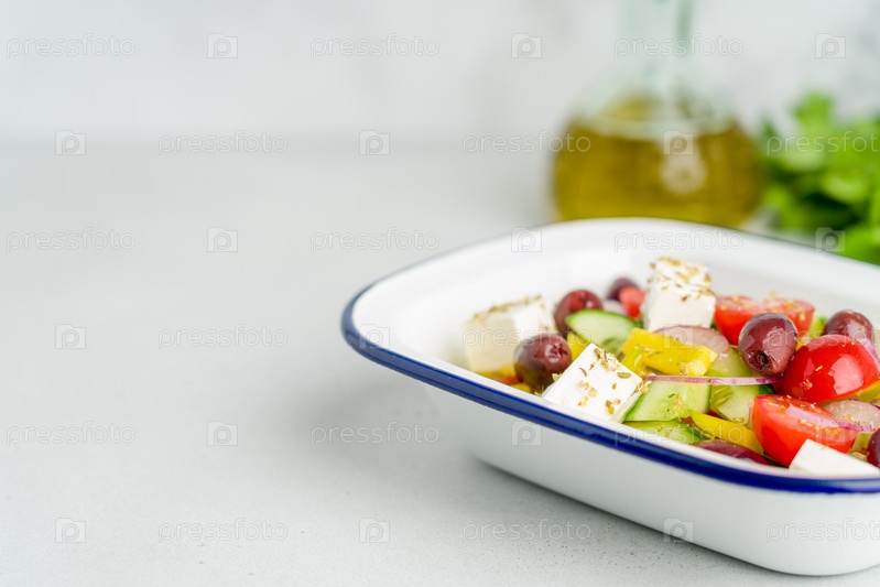 Вкусный греческий деревенский салат хориатики. Нарезанные кубиками овощи с орегано, оливковым маслом, сыром фета. Вегетарианский здоровый обед, полный витаминов и антиоксидантов. Диетическое питание. Копировать пространство