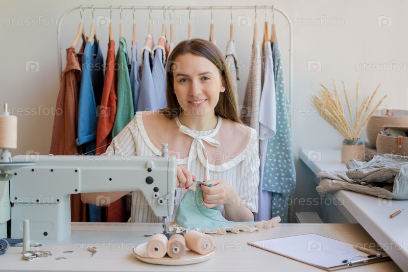 Счастливая молодая женщина, владелица бизнеса по производству одежды, улыбается в камеру, шья одежду в собственном ателье. Веселая швея, наслаждающаяся работой в студии моды, сидя на рабочем месте со швейной машинкой