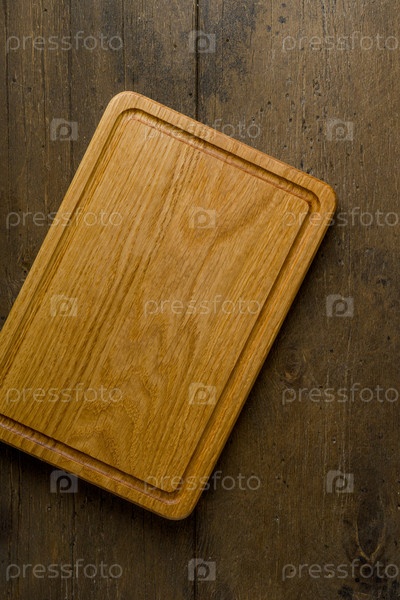 Вид сверху на коричневую разделочную доску на фоне темного дерева для приготовления пищи. Посуда из натурального дерева. Подготовка кухни. Кухонная техника. Вертикальный снимок, пространство для копирования