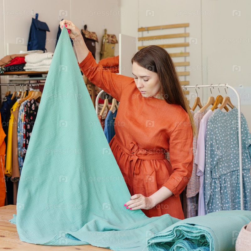 Профессиональный модельер-женщина с материалом для создания модной одежды в собственном ателье, рабочий процесс создания новой коллекции платьев. Женщина-портниха измеряет ткань в швейной мастерской