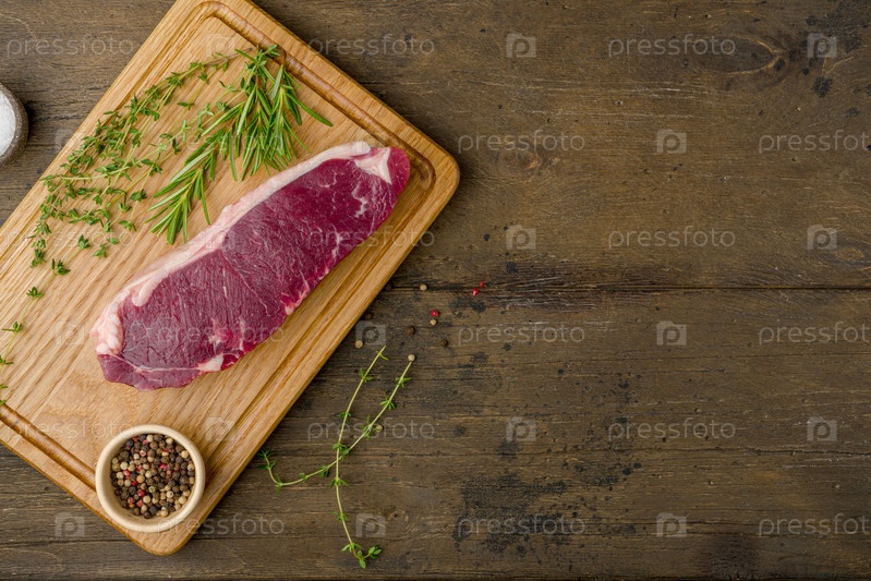 Сырой стриплойн с перцем, тимьяном и розмарином на деревянной разделочной доске. Изысканное говяжье филе подготовить к приготовлению с приправой. Горизонтальное, накладное, пространство для копирования