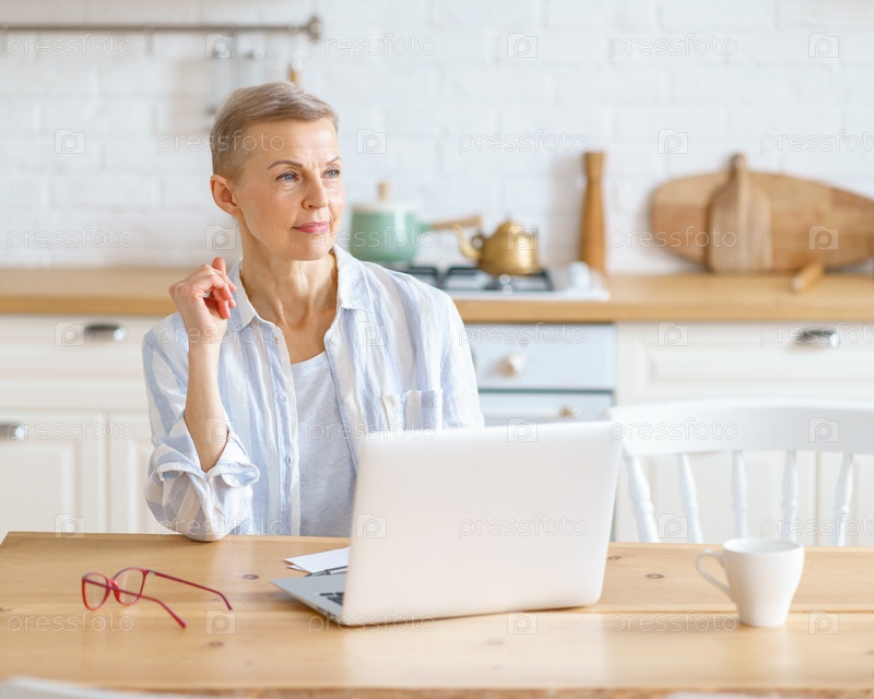 Счастливая мечтательная пожилая женщина в повседневной одежде смотрит в сторону и думает во время работы или серфинга в Интернете на ноутбуке, счастливая пожилая женщина 60-х годов наслаждается утром с кофе на светлой современной кухне