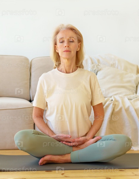 Мирная пожилая женщина в позе лотоса медитирует с закрытыми глазами дома, сидя на коврике для йоги на полу, в полный рост. Спокойная пожилая женщина, практикующая техники медитации и йогу в помещении