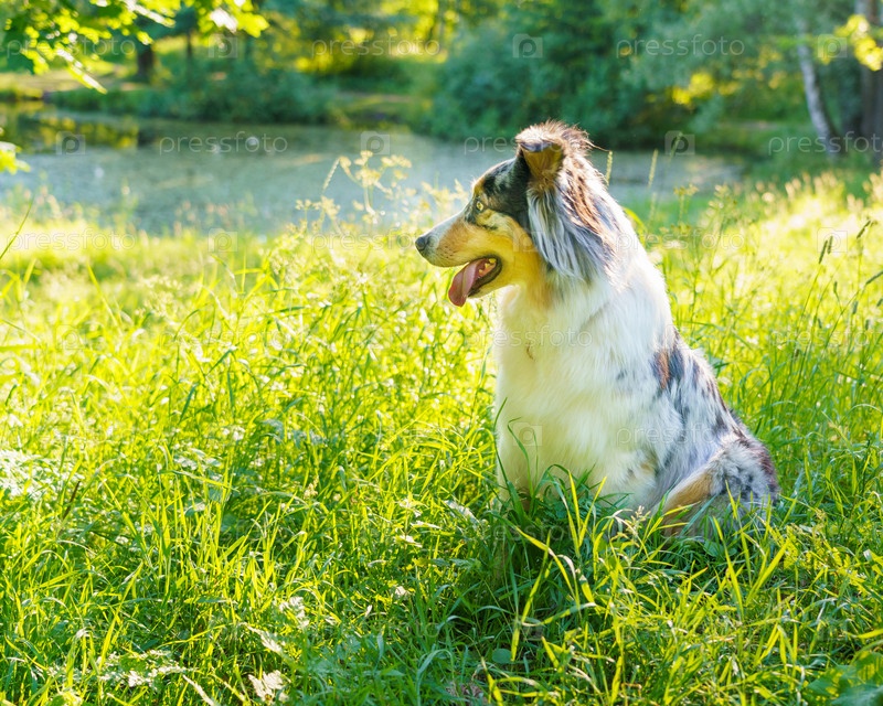 Прекрасная собака Австралийская овчарка позирует на улице с высунутым языком, очаровательный чистокровный питомец сидит в зеленой траве, смотрит в сторону и отдыхает после прогулки с владельцем в парке солнечным утром в летнее время