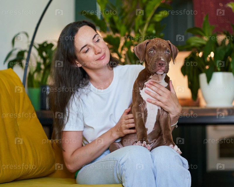 Любящий и заботливый родитель-питомец гладит и обнимает щенка питбуля. Горизонтальный снимок любителя собак и пушистого компаньона, сидящего в гостиной и расслабляющегося. Концепция родительства и ухода за домашними животными