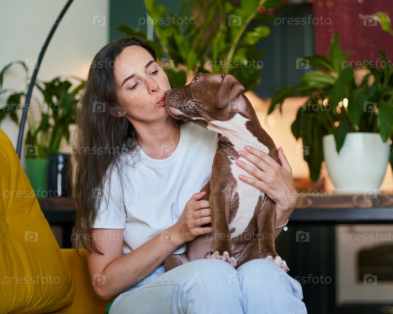 Целующийся и заботливый владелец домашнего животного гладит и обнимает собаку-питбуля. Любитель собак, ориентированный на домашних животных, и пушистые друзья сидят в гостиной и отдыхают. Растения на заднем плане. Концепция родительства и ухода за домашни