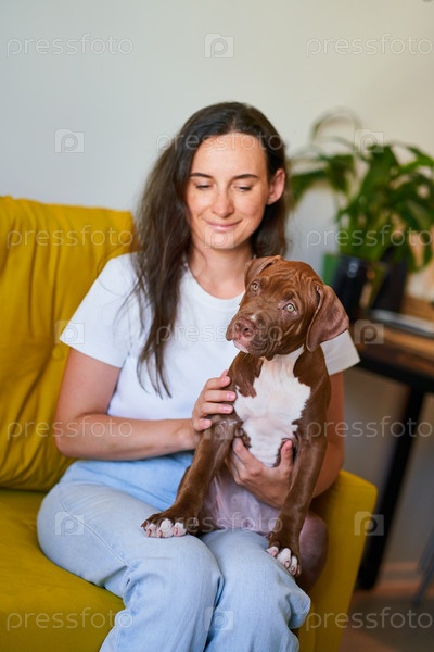 Эмоциональная поддержка животного, сидящего на коленях владельца домашнего животного во время терапии для домашних животных из-за карантина ковид-19. Очаровательный щенок американского питбуля и улыбающаяся женщина средних лет в гостиной проводят время вм