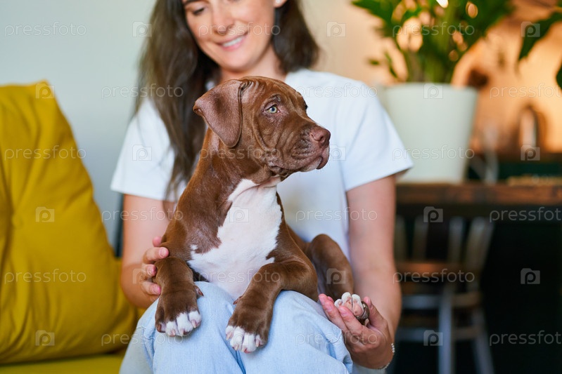 Коричневый и белый щенок питбультерьера смотрит в сторону. Улыбающийся и счастливый владелец собаки смотрит на питомца с любовью и радостью. Концепция эмоциональной поддержки животных во время карантина из-за ковид-19
