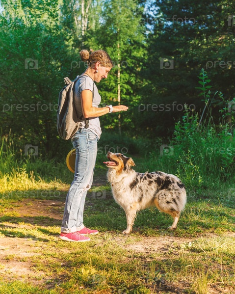 Улыбающаяся счастливая женщина в повседневную одежду в полный рост, играющая с милой собакой в парке в летний день, хозяйка домашнего животного дает команду оставаться молодой австралийской овчарке во время тренировки послушания на открытом воздухе
