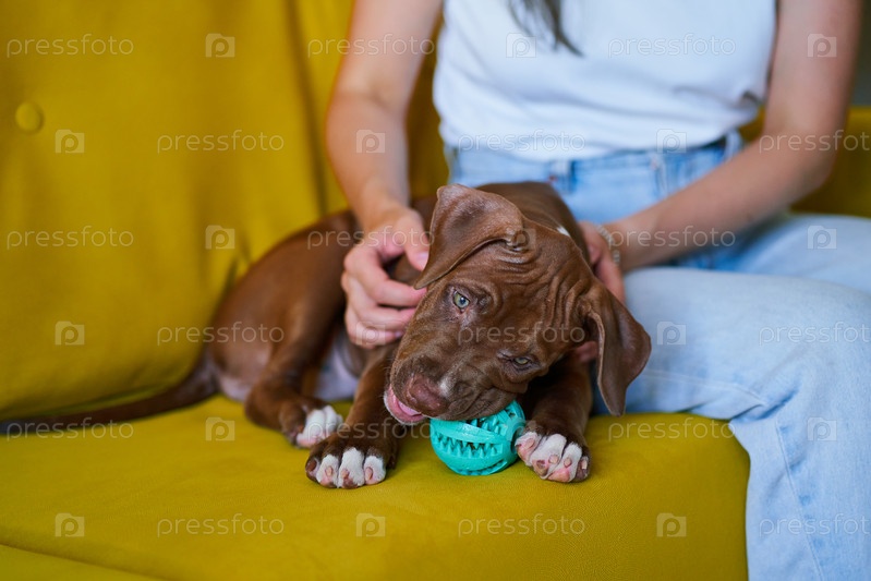 Очаровательный коричнево-белый щенок американского питбультерьера играет с игрушкой и наслаждается временем с любимой хозяйкой домашнего животного в повседневной одежде, сидящей на диване в гостиной. Любитель собак и пушистый щенок