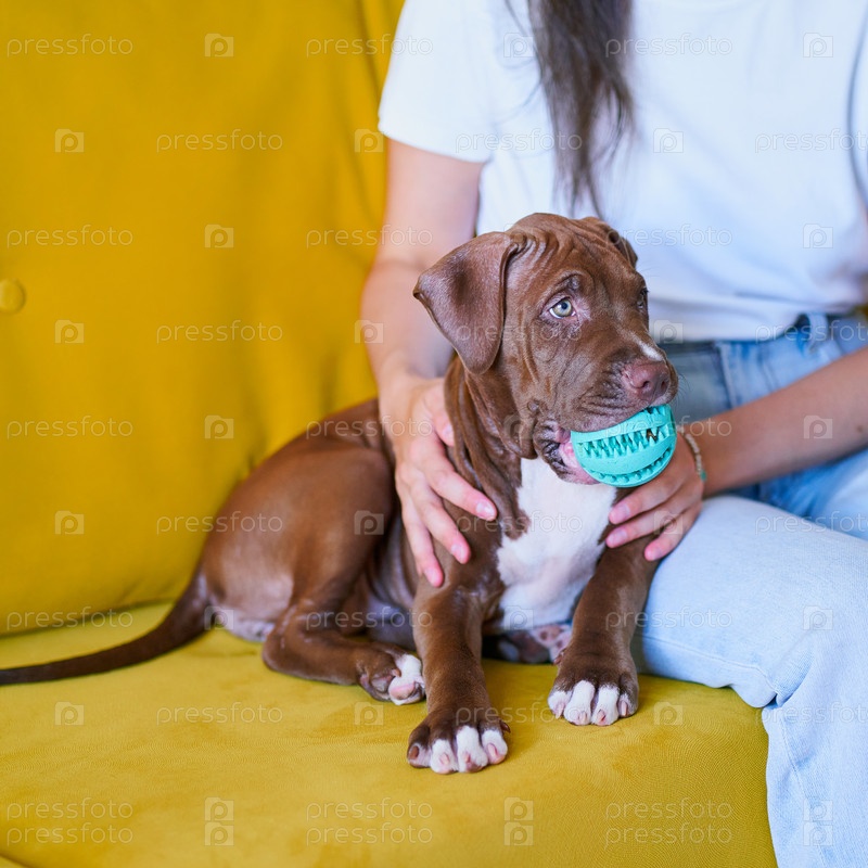 Обрезанная дружелюбная владелица домашнего животного гладит щенка питбуля на диване в квартире отеля для животных с эмоциональной поддержкой. Концепция пет-терапии для любителей собак. Очаровательный меховой малыш играет с игрушкой во рту