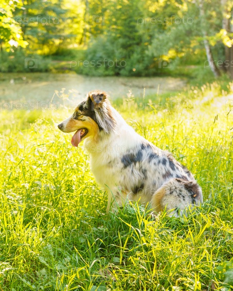 Прекрасная собака Австралийская овчарка позирует на улице с высунутым языком, очаровательный чистокровный питомец сидит в зеленой траве, смотрит в сторону и отдыхает после прогулки с владельцем в парке солнечным утром в летнее время