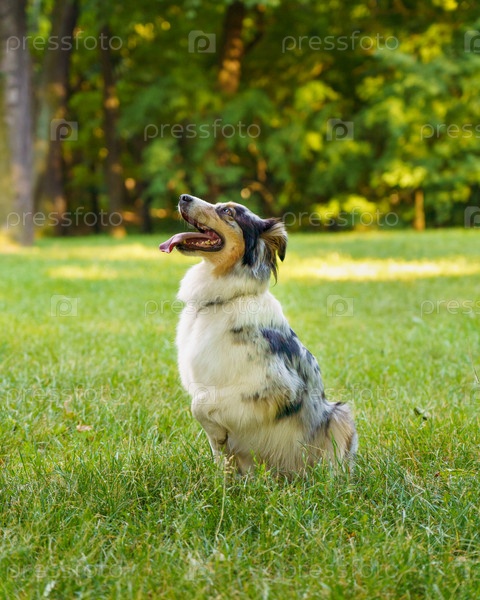 Прекрасная собака австралийская овчарка позирует на улице с высунутым языком, очаровательный чистокровный питомец сидит в зеленой траве, смотрит в сторону и отдыхает после прогулки с владельцем в парке солнечным утром в летнее время