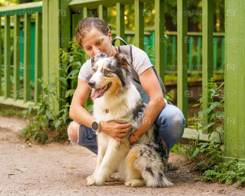 Счастливая 40-летняя европейка, сидящая на зеленой траве и обнимающаяся с молодой красивой австралийской овчаркой на лугу, позитивная владелица и милый чистокровный питомец, проводящие время вместе на природе в летний день