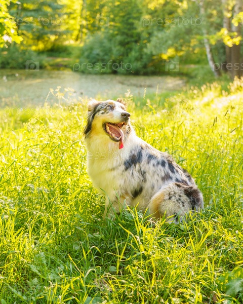 Прекрасная собака Австралийская овчарка позирует на улице с высунутым языком, очаровательный чистокровный питомец сидит в зеленой траве, смотрит в сторону и отдыхает после прогулки с владельцем в парке солнечным утром в летнее время