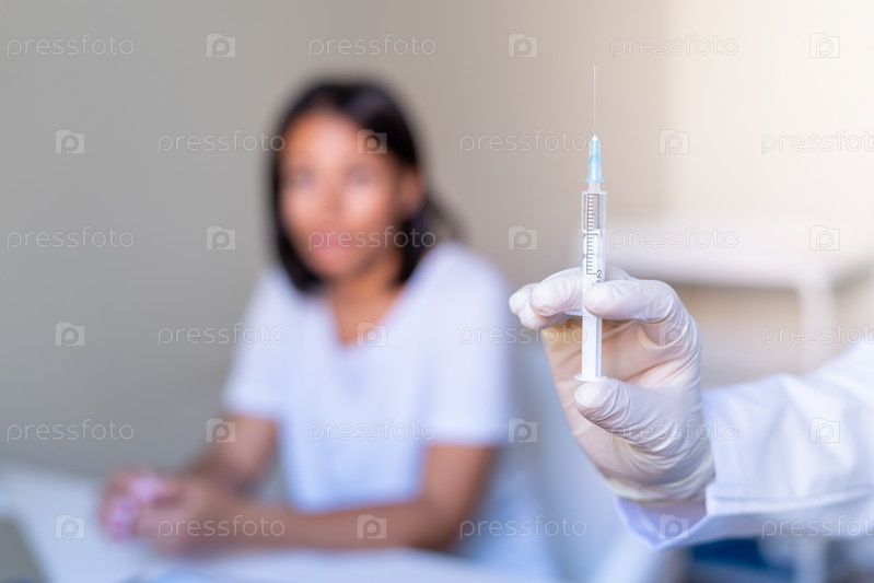 Безликий врач держит шприц перед вакцинацией от коронавируса размытой пациентке