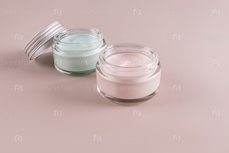 Две открытые косметические баночки с натуральным косметическим продуктом для ухода за собой. Органическая косметика. Цветной крем