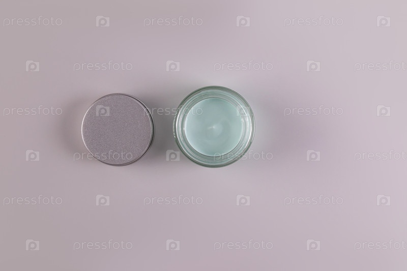 Вид сверху на открытую банку косметического продукта с нежной синей текстурой для повседневного ухода за кожей лица и тела. спа. массаж. Серый фон