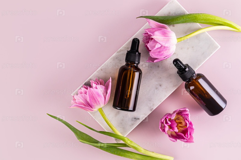 Два косметических флакона с пипеткой натурального органического продукта лежат на белом мраморном подиуме с нежными тюльпанами. Пустой макет. упаковка