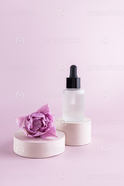 Модный косметический продукт, сыворотка в стеклянной косметической бутылке с капельницей для ухода за кожей лица и тела, стоящая на круглом цементном подиуме с цветком тюльпана