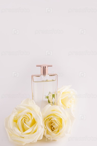 Роскошный прозрачный флакон женских духов или туалетной воды стоит среди белых роз. Передний план. Презентация аромата