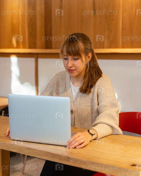 Молодая сосредоточенная женщина пользуется ноутбуком в кафе. Удаленная работа далеко от дома. Вертикальный