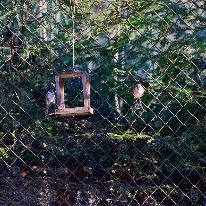 Скворечник на старом металлическом заборе. Два воробья сидят на сетке. Фон елового парка