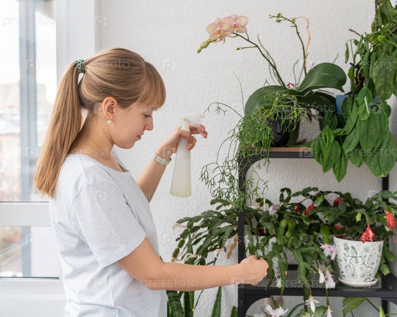 Молодая женщина поливает растения и цветы на балконе. Ботаника хобби. Садовник комнатных растений, ухаживающий за горшечными растениями. Домашний флорист. Забота о новой жизни. Концепция Дня Земли
