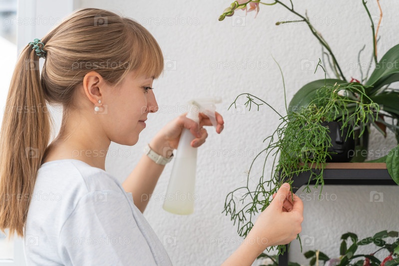 Молодая самка распыляет воду на комнатные растения и цветы на балконе. Домашний сад, концепция более зеленого мира, спасение планеты