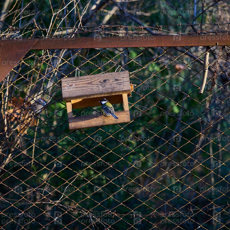 Синица в деревянном старом скворечнике ручной работы на заборе. Осенний солнечный свет. Фон парка