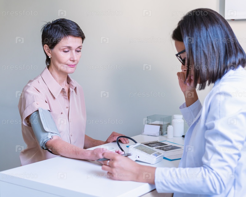 Врач измеряет артериальное давление пациента сфигмоманометром в офисе клиники