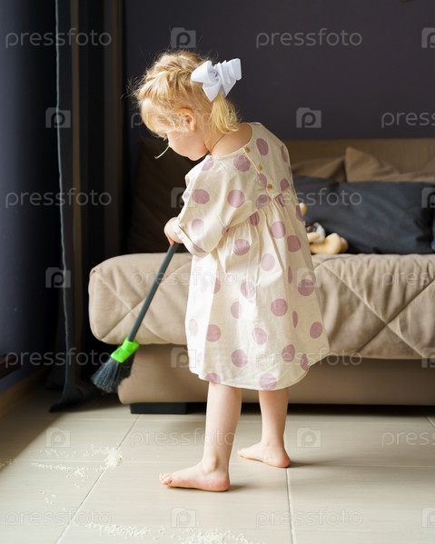 Очаровательная маленькая девочка с золотистыми волосами в льняном платье в горошек подметает пол метлой, помогает матери убирать комнату, снимок в полный рост. Маленький ребенок занимается домашними делами, проводя время дома