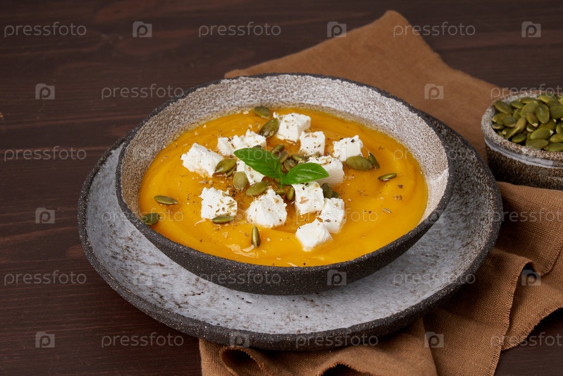 Традиционный тыквенный крем-суп с сыром фета. Деревенское домашнее блюдо из намазанной тыквы, специй и базилика. Осеннее свежее сезонное блюдо на деревянном фоне. Крупный план, горизонтальный, вид сбоку