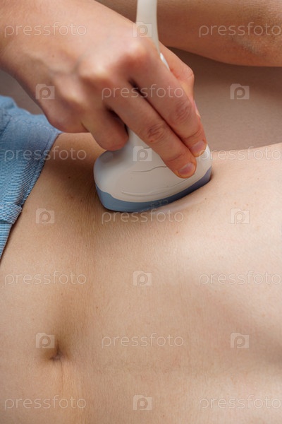 Крупный план сканирования нефролога с помощью выпуклого датчика брюшной полости. Осмотр врача при нефроптозе. Высокотехнологичное лечение на дому. Помощь специалиста по УЗИ