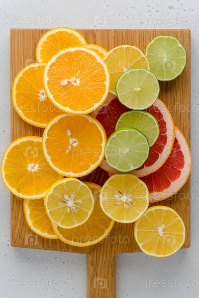 Цитрусовая композиция на разделочной доске. Многие половинчатые лимоны, лаймы, грейпфруты. Вертикальный