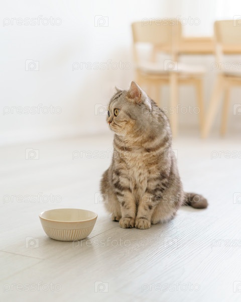 Шотландский голодный кот хочет есть, жалко выглядя котенком, сидящим на полу кухни и ожидающим еды